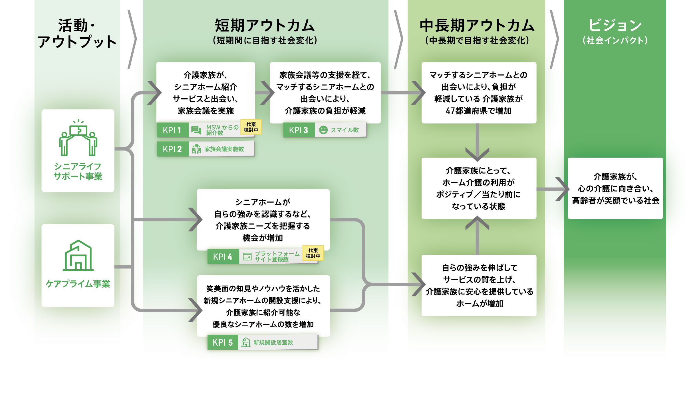 当社は事業成長を伴いながら、ポジティブで測定可能な社会的・環境的インパクトを創出するインパクトスタートアップ企業として、ロジックモデルとインパクトKPIを設定し、「家族が心の介護に向き合い、高齢者が笑顔で居る社会」の実現を目指します。