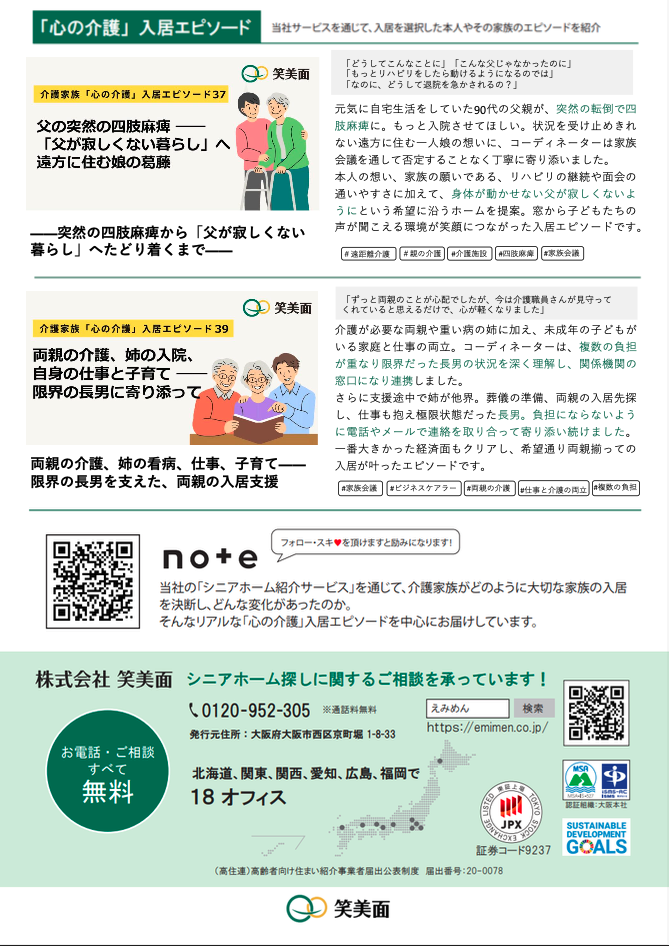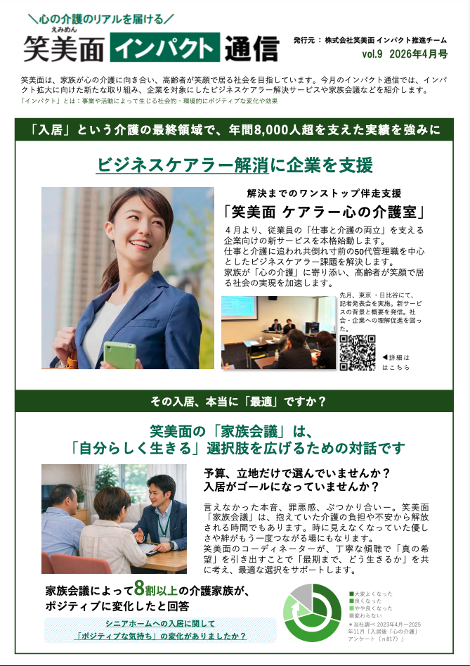 シニアホーム※1紹介事業の株式会社笑美面(本社:大阪市西区)は、ニュースレター『笑美面インパクト通信』4月号を 2026 年 4 月 6 日に発行しました。当ニュースレターは、「シニアホーム紹介サービス」を利用し、大切な家族の入居を選択した介護家族の生活の変化「介護家族の入居エピソード」などを紹介しています。