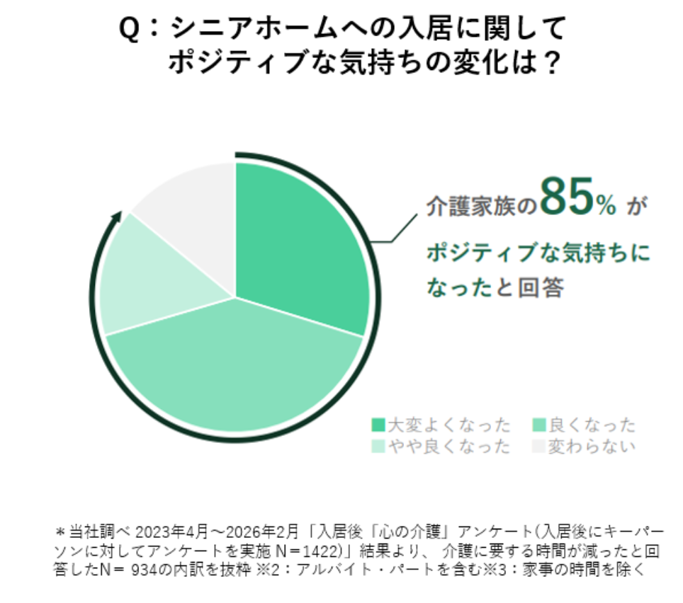 シニアホーム※1紹介事業を行う株式会社笑美面(本社:大阪市西区)は、日本記念日協会により認定された記念日「心の介護に向き合う日」(5 月 6 日)の 1 周年を迎えるにあたり、介護家族を対象とした独自アンケートの結果を公表します。当記念日は、介護による共倒れを防ぎ、「心の介護」に向き合える社会を広げることを目的としていま す。「入居後『心の介護』アンケート」(期間:2023 年 4 月~2026 年 2 月)の結果、介護家族の 85%が「シニアホーム入居後、気持ちがポジティブに変化した」と回答しました。今回の結果は、身体介護を専門職に委ねることで、介護家族が「心の介護」に向き合えるようになったことを示しています。本来の生活を取り戻し、心にゆとりが生まれた結果と当社は捉えています。
