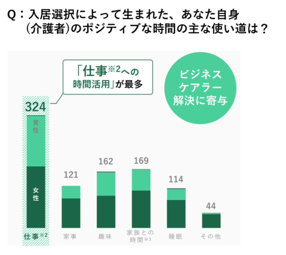 笑美面は、本人の人となりや価値観、これまでの暮らし方に適したシニアホームへの入居支援を行うことで、身体の介護は専門職に安心して委ね、介護家族が安心して「心の介護」に専念できる環境づくりに取り組んできました。今回の調査結果は、その成果の一つの指標として捉えています。調査は、入居後のキーパーソン 1,422 人に対して実施し、934 人が「介護に要する時間が減った」と回答しました。